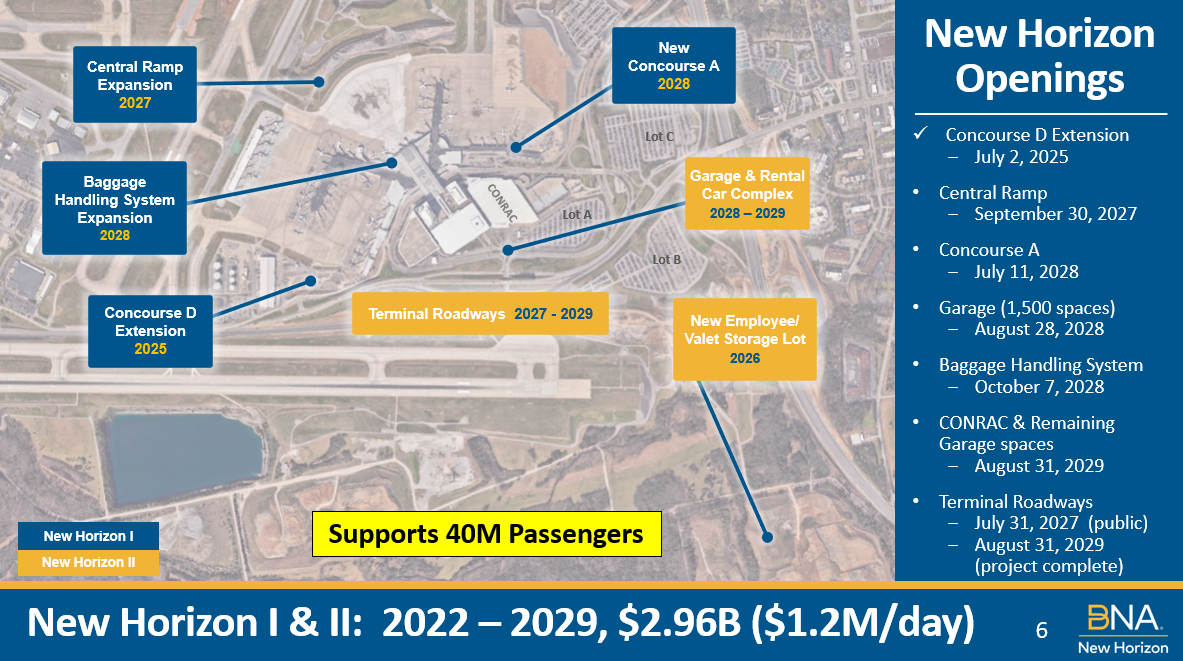 Amongst the accolades received and milestones accomplished in Fiscal Year 2025, progress continued on New Horizon, the transformative $3 billion growth and expansion program at BNA. New Horizon builds on the success of BNA® Vision_,_ which wrapped up in February 2024, and marks the next chapter in BNA’s ongoing transformation to meet the unprecedented growth of Nashville and travel needs of passengers. Scheduled for completion in 2029, New Horizon is essential to enabling BNA’s ability to support 40 million annual passengers in the future.
